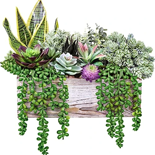 - Color: This artificial succulent plant arrangement is overflowing with a wide variety of faux succulents in various shades of green and purple with lots of texture. The succulents come artfully potted in a distressed wooden planter box given a rustic look to blend in any farmhouse decor style. Natural pebbles are added for realism.