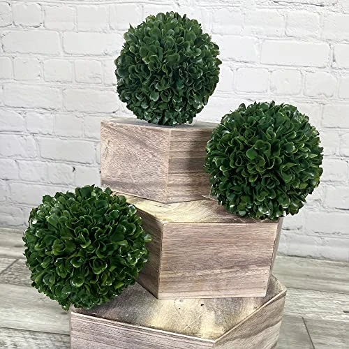 - Set of 3 Realistic looking faux preserved artificial boxwood ball plant 5 inches in diameter in rich green foliage will enhance any space and every occasion.
