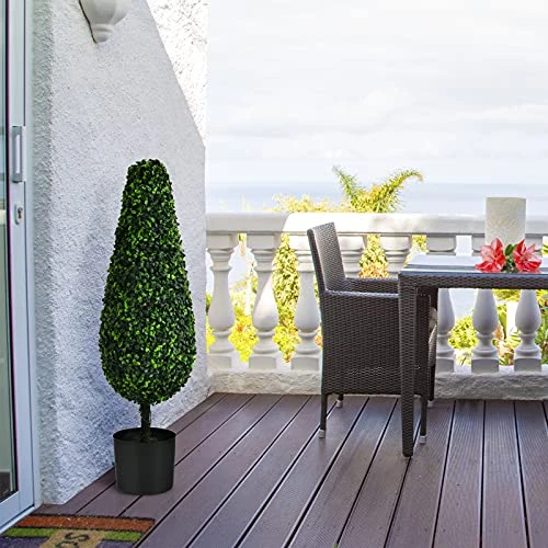 - 【Versatile Use】: The faux topiary tree is equipped with a black plastic pot and feel free to be placed at home, living room, bedroom, terrace, office, hotel, garden, reception area, or use 2 to flank your front door, adding a pop of color and looking neat.