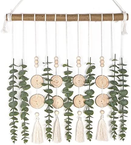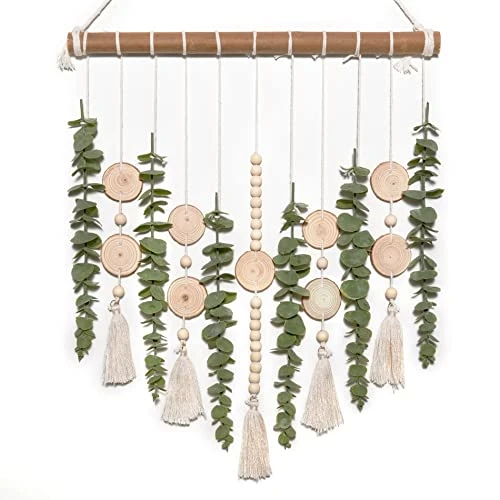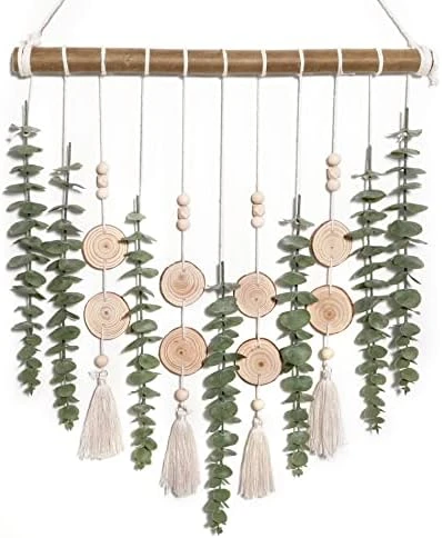 - 【Purely Handmade, Value for the money】 This eucalyptus wall hanging is pure handmade. It may vary slightly in shape and size due to each detail being hand crafted. Eucalyptus vines, wood slices, beads, tassels are purely hand tied to the branches.