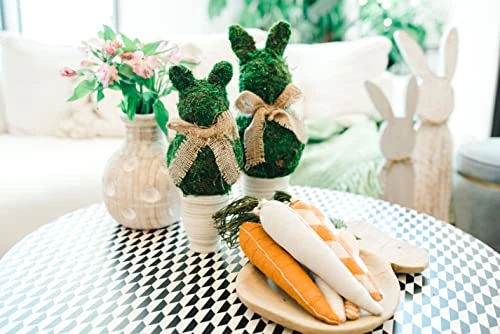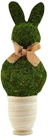 - Preserved moss ball bunny shaped topiary with burlap accent bow rests in textured stoneware pot.