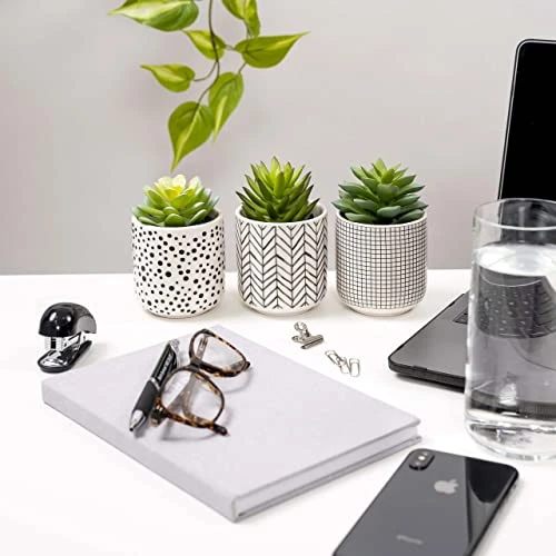 - SUPER CUTE AND PERFECT SIZE – 4.75″ high – these cute mini succulents in black and white pots suit book shelf decor, bathroom decor, dorm decor, mantle decor, or office desk decor