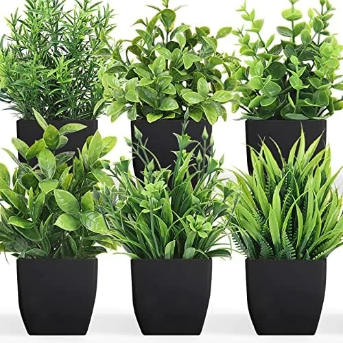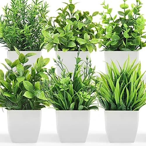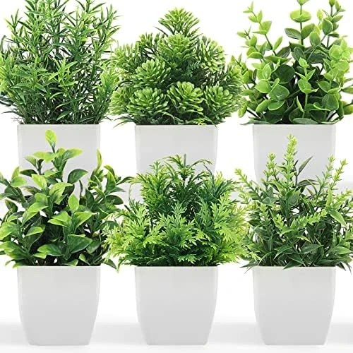 - 6 PACK AND PERFECT SIZE – The small artificial plants size is 3.74″ x 9.6″ , 3.9″ x 7.1″ . Package inclued 6pcs artificial plants with 20pcs cute stikers. When you receive the artificial potted plants, please comb the branches and leaves to achieve the best shape.