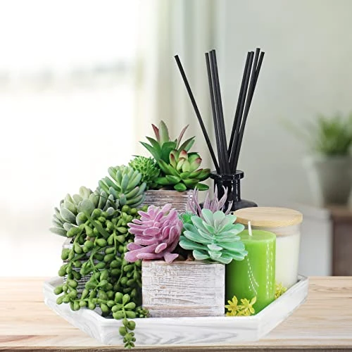 - Color: These fake potted succulents plants arrangements are overflowing with a wide varieties of succulents featuring a stunning shades of green, gray green, flocked green and flocked purple colors, and some have red accents. They are potted in rustic wooden planter boxes with pebbles for a realistic look. The Decorative Rustic Wooden Box features dusty dappled brown coloring with a distressed white finish to give you a rustic warm, natural, and cozy accent fit for any space and season.